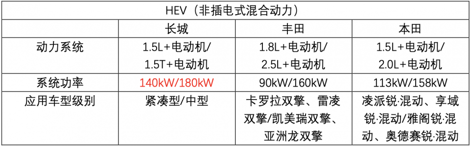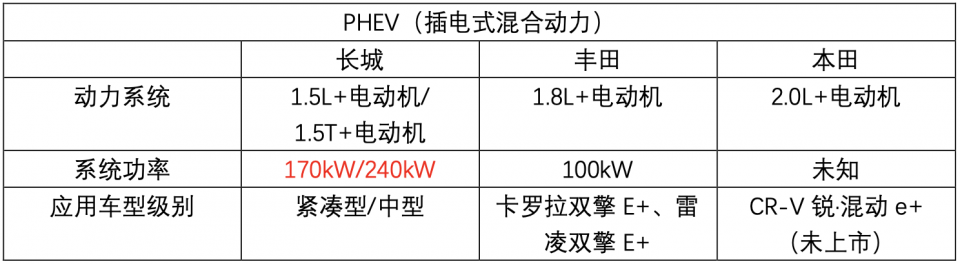 从对比可以看到,长城在动力上比丰田、本田已有的同级别产品都更有优势!不仅如此,长城更推出了PHEV四驱混合动力架构,即1.5T发动机+电动机+P4电驱动后桥,综合最大功率达320kW,或将搭载在中大型级别车型上。