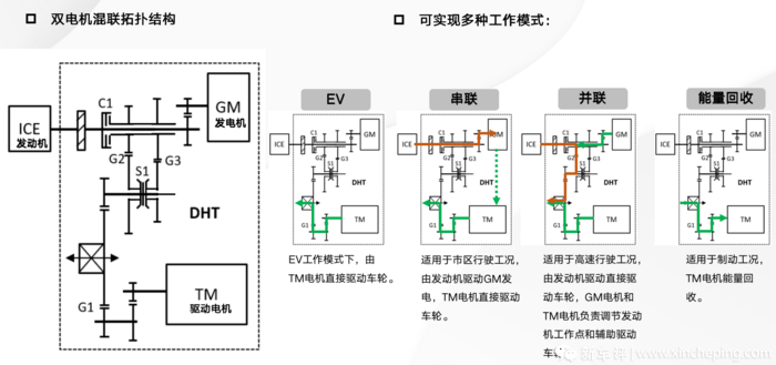 柠檬混动DHT属于双电机混联拓扑结构,有EV、串联、并联、能量回收四种工作模式。