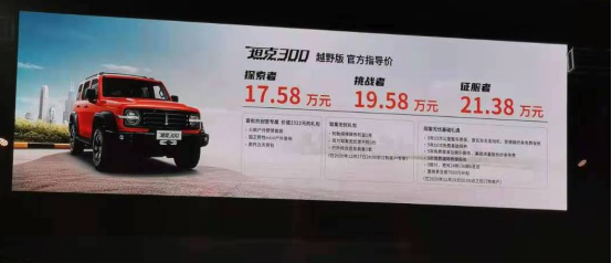 12月17日,魏派坦克300 (配置|询价)在北京798艺术区正式上市。坦克300全系搭配2.0升直列四缸直喷增压发动机并匹配采埃孚8AT变速箱。新车提供探索者、挑战者和征服者三个版本,官方建议零售价为17.58万到21.38万元,具体车型和其对应价格参见下表: