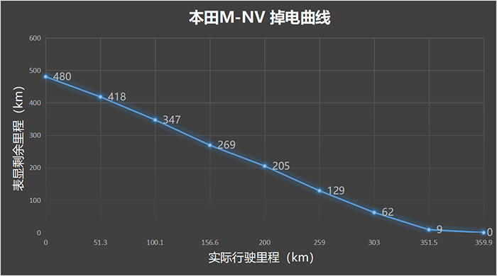 经过了一整天的光电测试,NEDC续航480的本田M-NV的最终成绩也就出来了,在气温为27度的广佛地区以高速路况行驶的状态下,本田M-NV的实际续航里程为359.9km。这样的续航表现对于偶尔的跨市出行来说还是没什么问题的,市区通勤更是毫无压力。需要提醒的是,当仪表显示乌龟标识时,整车的实际续航里程也仅有8公里左右,如果这个范围内没有充电桩,就只能够选择叫拖车了。