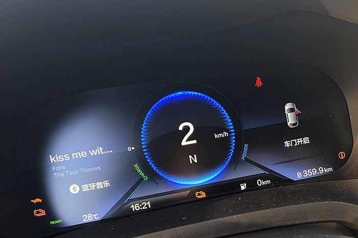 而后,我们马不停蹄地驶上佛山一环高速,并且以100km/h的速度进行了巡航测试。在这样的时速状态下,纯电动车型的电机会处于高负荷状态,其续航表现也会与理想状态下的NEDC续航成绩有较大的差异。