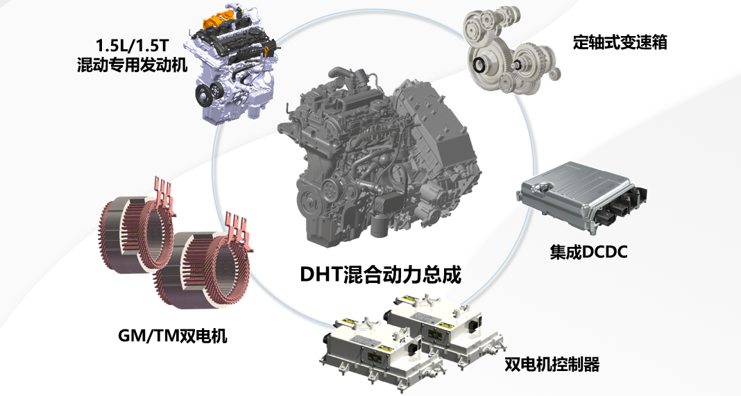 1.5L+DHT100是以1.5L自然吸气发动机为主的HEV混合动力系统,它搭载18千瓦时的锂电池包,动力系统功率为140~170kW。动力系统综合效率最高可达50%以上,百公里综合油耗可达4.6L,未来将应用于紧凑级车型。
