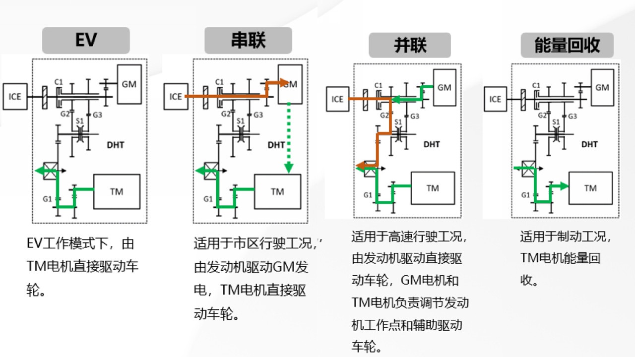 目前主要的混合动力系统主要分为串联增程、单速混动、双速混动等等,而长城柠檬DHT则是双速混动形式,整套系统由发动机、定轴式变速箱、GM/TM电动机、双电机控制器、集成DCDC所组成,从而实现EV、串联、并联、能量回收等多重工作模式,实现各种驾驶场景下动力与油耗的平衡。