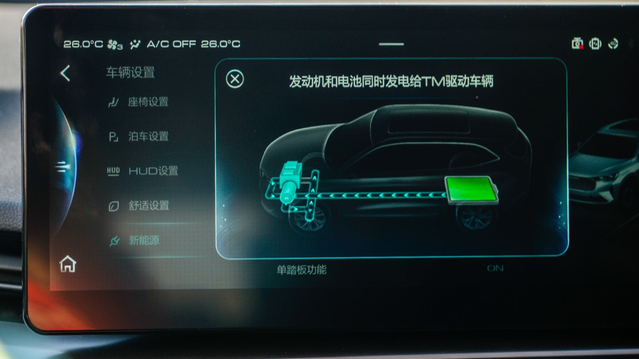 持续加速随着油门开度和速度的增加此时发动机介入工作,这个过程中并不会感受到明显的介入的感觉,平顺性上的表现比较好,但是在发动机介入之后车内的噪音会有小幅增加。另外,在松开油门踏板之后车辆会进入动能回收模式,动能回收模式下的拖拽感并不明显,并且这套混动系统支持单踏板模式,也就是说仅使用油门就可以完成行驶和停车。