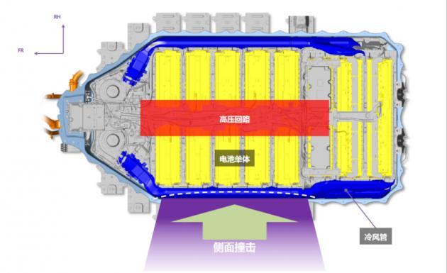 而对于锂电池来说,外部碰撞和穿刺是电池安全最危险的外部因素,因此奕泽E进擎巧妙地采用冷风管作为缓冲吸能区,当车辆在遇到外部冲击时,两侧的管路能起到充当防护梁的作用,降低甚至阻挡冲击对电池包的影响,保护电池不受到直接损伤。