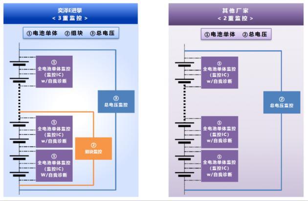 一汽丰田奕泽E进擎的电池配备了三重电压监控,除常规的监控单体电压、系统总电压外,还增加了电池模块的电压监控。从而确保了电池组从最小的组成单位,到最大的组成单元,都处于严格的监控之下,进一步提高电池的安全性和可靠性。