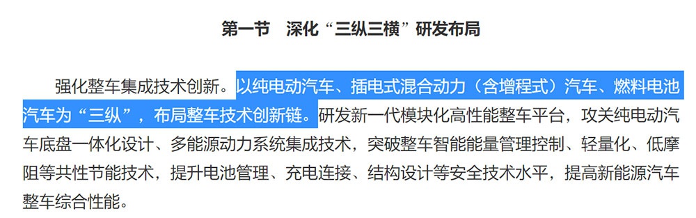 比如《新能源汽车产业发展规划(2021—2035年)》中明确提出,要以纯电动汽车、插电式混合动力(含增程式)汽车、燃料电池汽车为“三纵”路线,布局整车技术创新链。