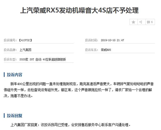 之前的老款荣威RX5,小编先都放一边,只说目前在售的2020款荣威RX5,这一位车主就反映新车400公里的时候就出现异响问题,并且一直都得不到完美的解决,可能不少网友会觉得,这是小事,干嘛这么计较。小编想问一下,如果换做是你,一台新车400公里,出现此类问题,你心里难道不会介意?如果说,车主行驶了很久出现这样的问题,小编还真觉得没啥可说,毕竟,车子行驶久了或多或少是会有些小毛病,但是,一台新车就有如此之品质,上汽集团是不是要好好提升一下自身的品质了?
