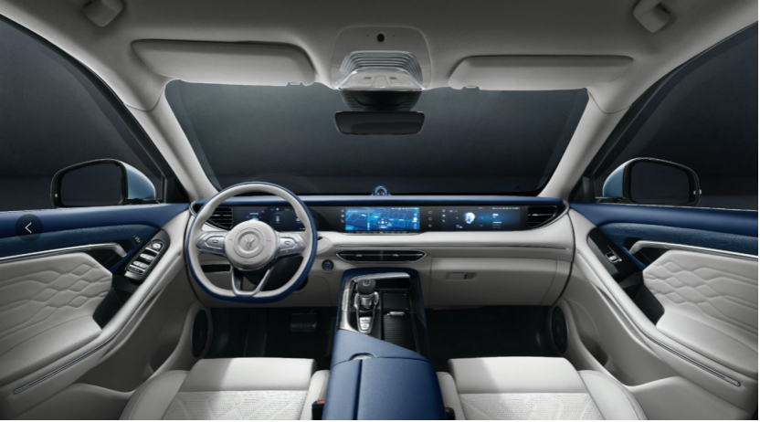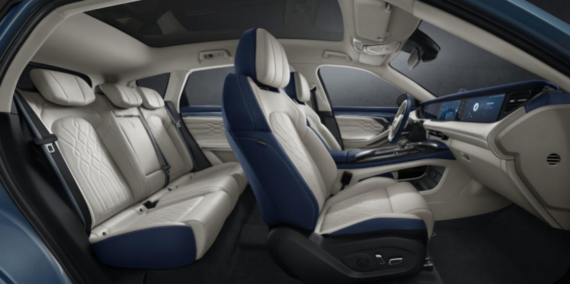 4、内饰中,岚图FREE采用游艇式座舱设计理念,蓝+米的配色以及车内真皮的包裹营造了不错的豪华感。另外智能层面,岚图FREE采用智能座舱,一体式可升降三联屏、5G T-Box、VOYAN ID车载生物识别系统、四种手势控制等智能功能均有配备。
