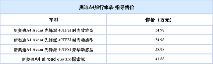 与此同时,奥迪品牌还正式宣布了新款奥迪A4 旅行车家族正式上市的消息。新款奥迪A4 旅行车家族共推出了4款车型,其中三款为标准Avant车型,售价区间为34.98-38.98万元;还有一款为allroad车型,售价为41.88万元。