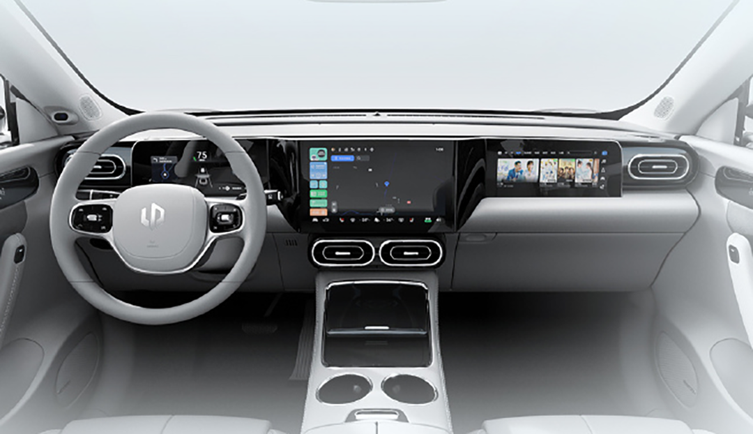 可以看到,新车内饰采用的是较为简约的风格来进行装饰,配色也以浅色系为主。在设计语言上,各类设计元素高度统一,像是回字形的空调出风口以及方向盘上的多功能按键等等,整体性较强。在配置上,除了双辐式的方向盘、三联屏以外,还可以看到在左侧A柱上的人脸识别摄像头。而中控台上的三块屏幕也各司其职,像最右侧的屏幕,为副驾驶娱乐屏幕。