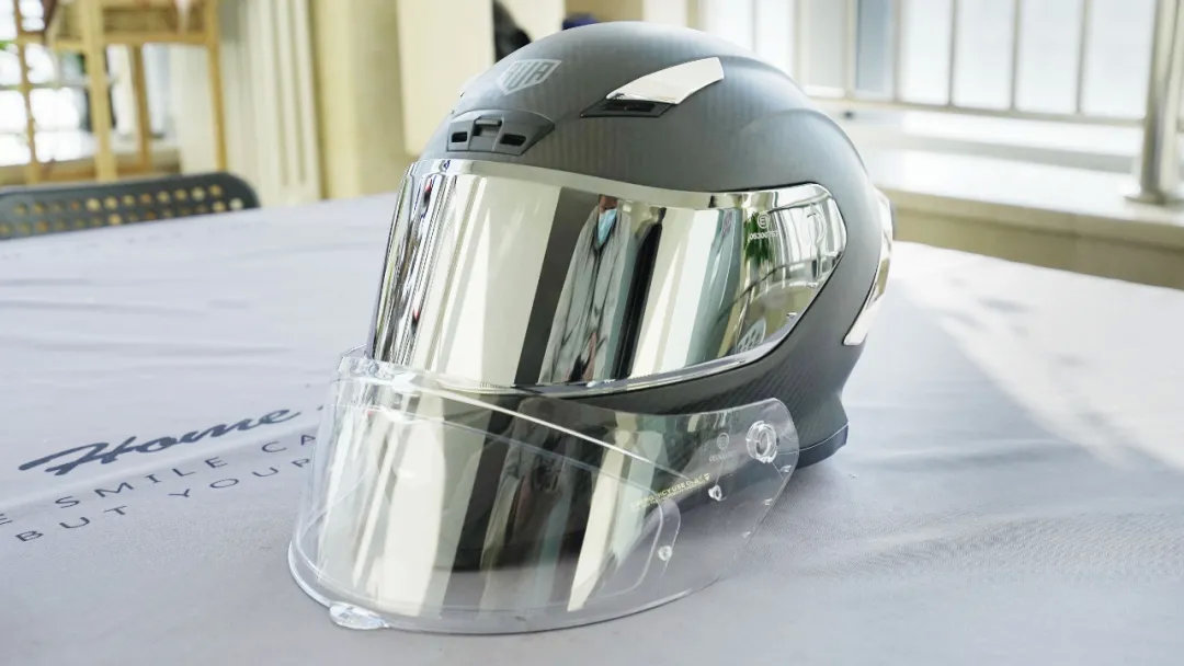 这款KYT的NF系列头盔笔者用过很长一段时间,盔型设计符合亚洲头型,佩戴舒适。其面镜质量很好,透过面镜的视野没有畸变且通透清晰。而且采用双镜片设计,内置的遮阳镜也有着很好的清晰度。