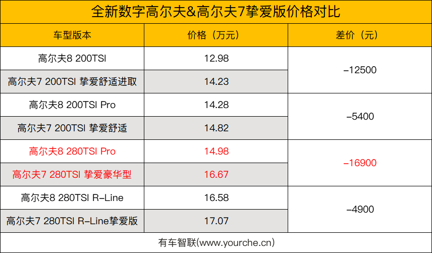 且不说上述的众多数字化配置竞品车型有没有,就拿7代车型和8代车型对比你就能感受到来自大众满满的诚意。首先在售价方面高尔夫8 280TSI Pro车型比相同排量版本的高尔夫7 280TSI 挚爱豪华型足足便宜了16900元。