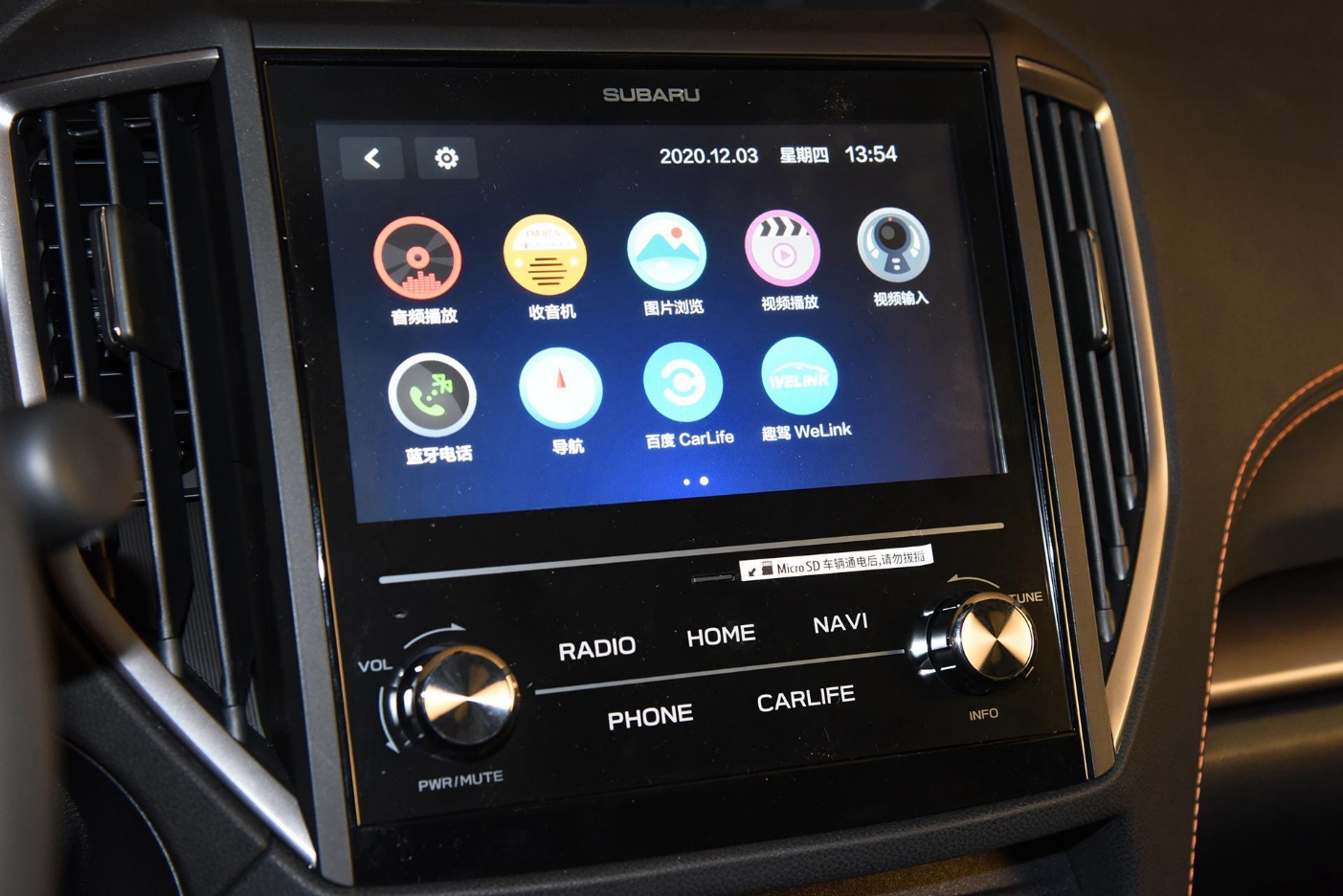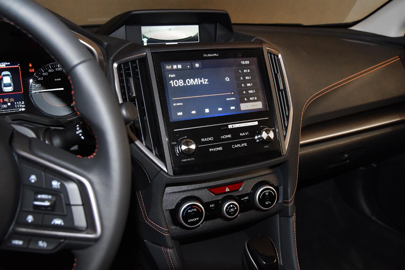 8英寸中控大屏支持GPS导航、手CarLife、蓝牙电话等功能,而在中控大屏上方还有一个斯巴鲁车型的标志性配置,一个小块液晶屏幕能够显示示四驱系统中四个车轮的动力分布、车辆倾斜角度和空调温度等诸多实用信息。