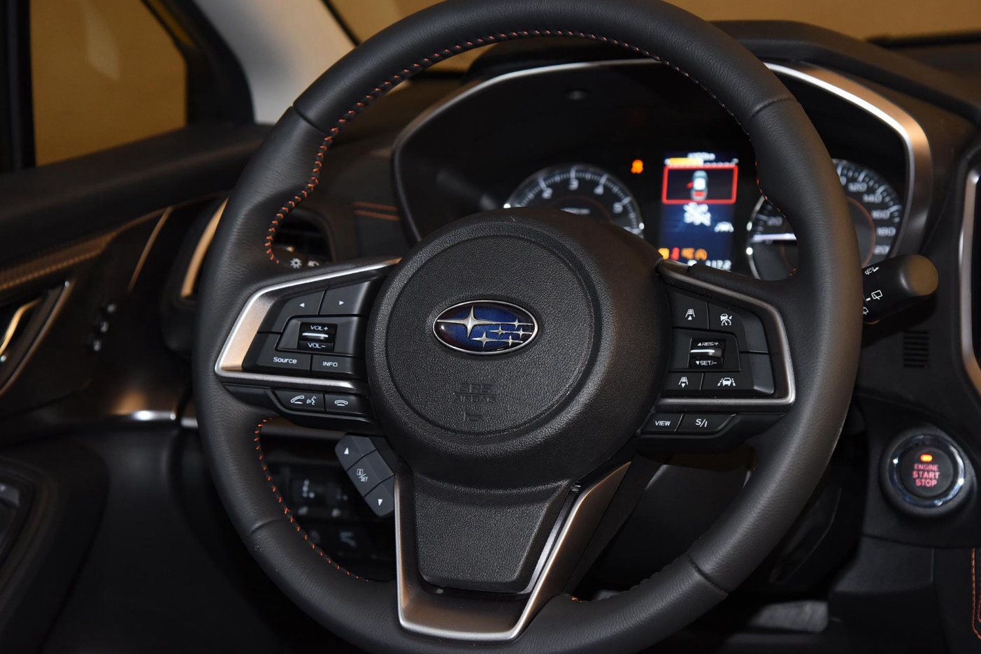 三辐式多功能方向盘造型依旧为斯巴鲁家族化设计,采用真皮材质包裹,方向盘左侧分布着音量控制、语音识别等按键,右侧按键用来控制斯巴鲁EyeSight驾驶辅助系统,混动版仅在左右两个表盘中间增加了蓝色的背景色,以表明混动车型的身份。