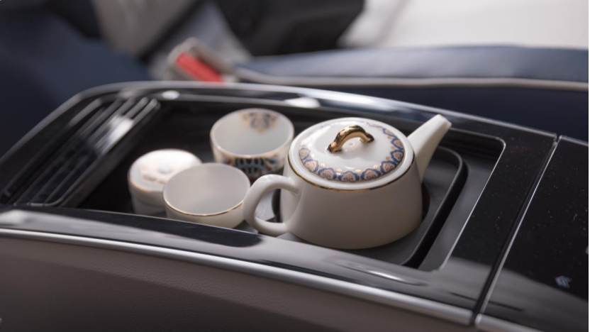 来到后排你会发现有个“电动小火车”它其实是设计师别出心裁的在车内设置的一个“魔吧”移动中控台,它可以通过语音或者按键控制,穿梭于车内,同时里边提供制热和制冷功能,“小火车”后半部储物格还能升降,可以放茶具等物品。