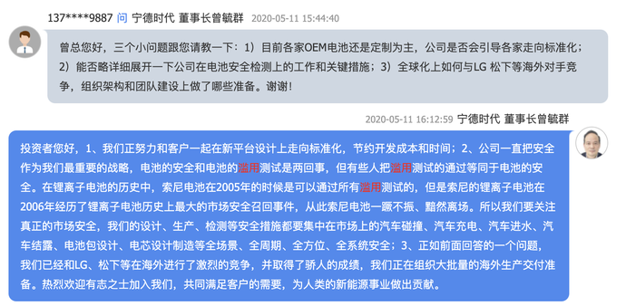 5月11日,宁德时代董事长曾毓群在2019年度业绩网上说明会时如此回应,对于针刺测试,他明确称:“电池的安全和电池的滥用测试是两回事,但有些人把滥用测试的通过等同于电池的安全”。意思就是“针刺测试”对于电池安全性没有任何意义,至于“有些人”说的是谁也不言自明。