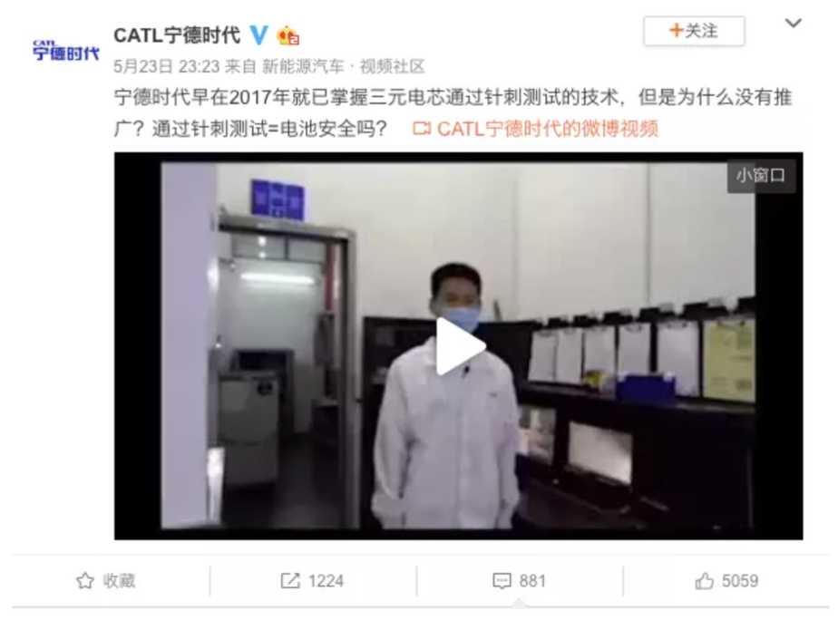 5月22日、5月23日,宁德时代连续发出两段视频自证,对宁德时代系列的三元电池均作了测试。同时,宁德时代还在视频中晒出文件,宁德时代让三元电芯通过针刺测试的技术,在2017年通过德国的测试认证。