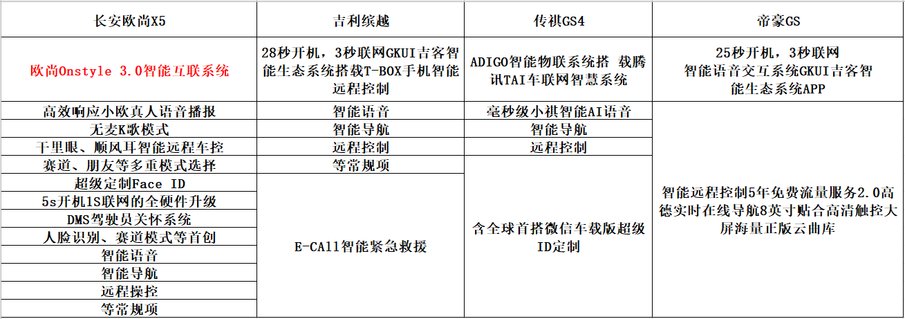 首先是价格方面,以这四款车的高配版价格做对比,可以看出传祺GS4的价格要远高出其他三款车型,欧尚X5的价格最便宜。但价格高配置就丰富吗?显然未必!