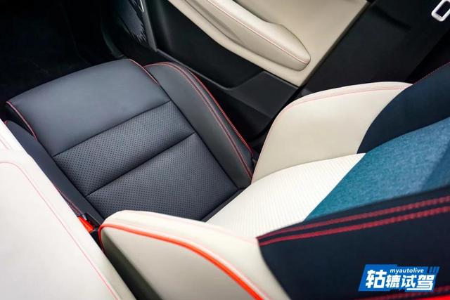 单宁拼接皮质的一体式座椅,包裹性不错,舒适性值得一夸。