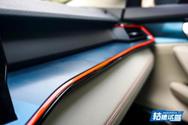 进入车内,中控台和门板上都有一些菱形几何设计元素,融入了氛围灯在其中,经过隧道时方看出其巧思搭配。