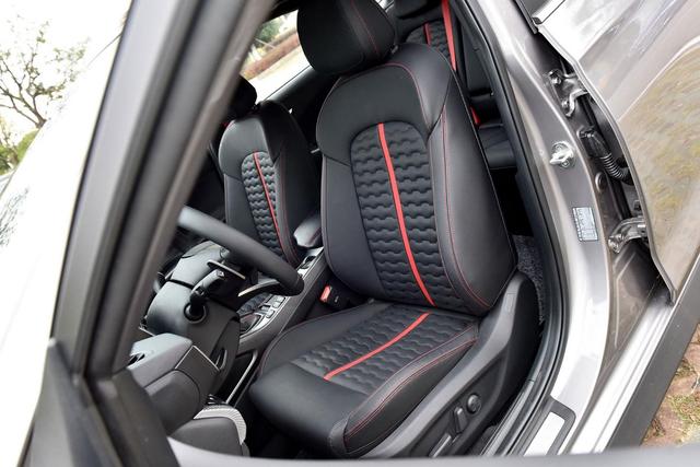 整车内饰以黑色为主,前排座椅采用了仿皮材质,并且座椅上增加了红色线条的点缀以及"城墙纹理"的融入,都让座椅运动感表现不错,除了入门版车型外,其余车型均配备座椅电动调节和加热功能。