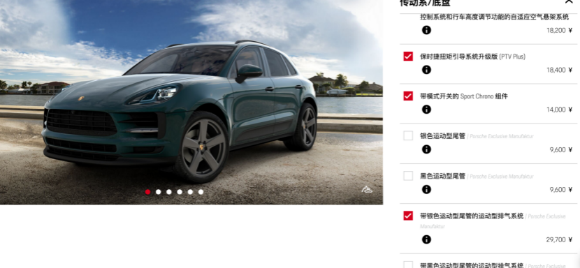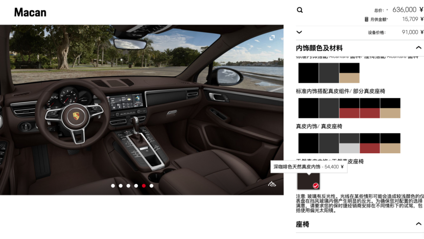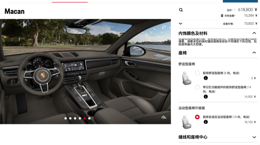 首先你要知道保时捷的主要卖点就是在选装上,很少有人会买“素车”。而且保时捷如果不选配,裸车真的非常不堪入目。因为你会发现,以Macan为例没天窗、没真皮座椅,没有座椅加热/通风、连座椅调节也只有一两个小按钮,而且一些热门的配置也没有,想想那画面就觉得很尴尬,谈不上任何的科技感、舒适度,这也就是为什么那么多人要花几万,甚至几十万的价格去选装。