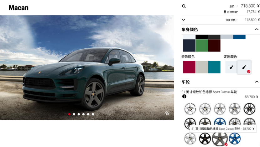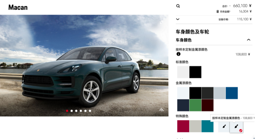 图中的Macan我选择了最贵的车漆和轮圈,仅在这一部分,价格就高达16万多元,当然了这是一种任性选择,一般消费者在这部分选配都在4万元左右。
