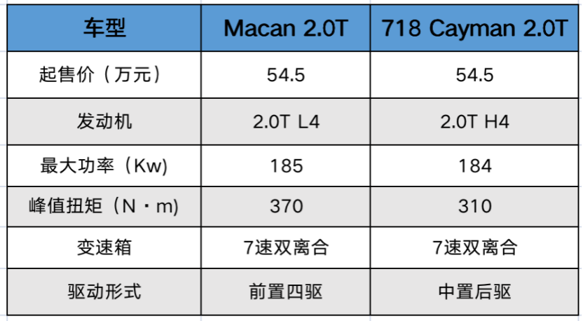 同样起步价54.5万元的718也同样配备了2.0T发动机+7速双离合变速箱,但参数与Macan不一样,而车身颜色有4种,同时还有18英寸轮圈、2种内饰、胎压监测、前后雷达、启停、运动座椅、前排加热、主驾座椅记忆都有配备,这么一看也还行,只不过外观会普通一些。