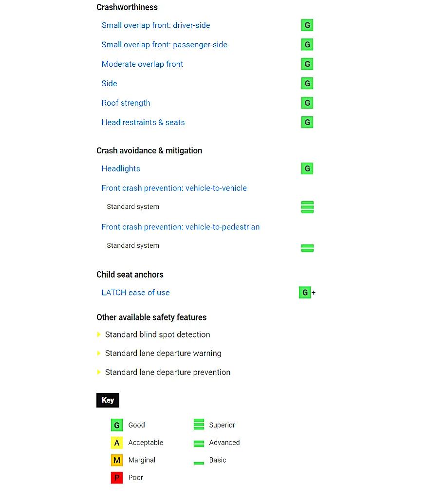 碰撞成绩列表从上到下的项目分别是25%偏置碰撞主驾驶侧和副驾驶侧、40%正面偏置碰撞、侧面碰撞、车顶强度、头枕和座椅,每一项的评分均获得了G级(优秀)的成绩。可以说,能拿的满分,全新Sienna都给拿上了。