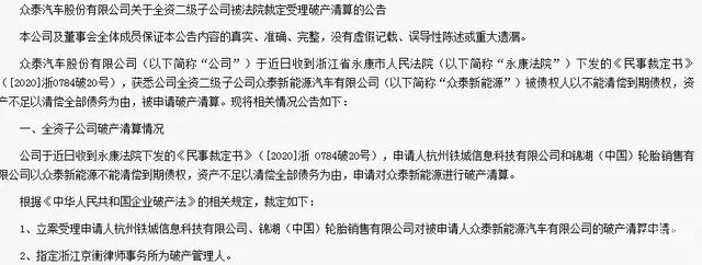 真的熬不过了,众泰母公司破产