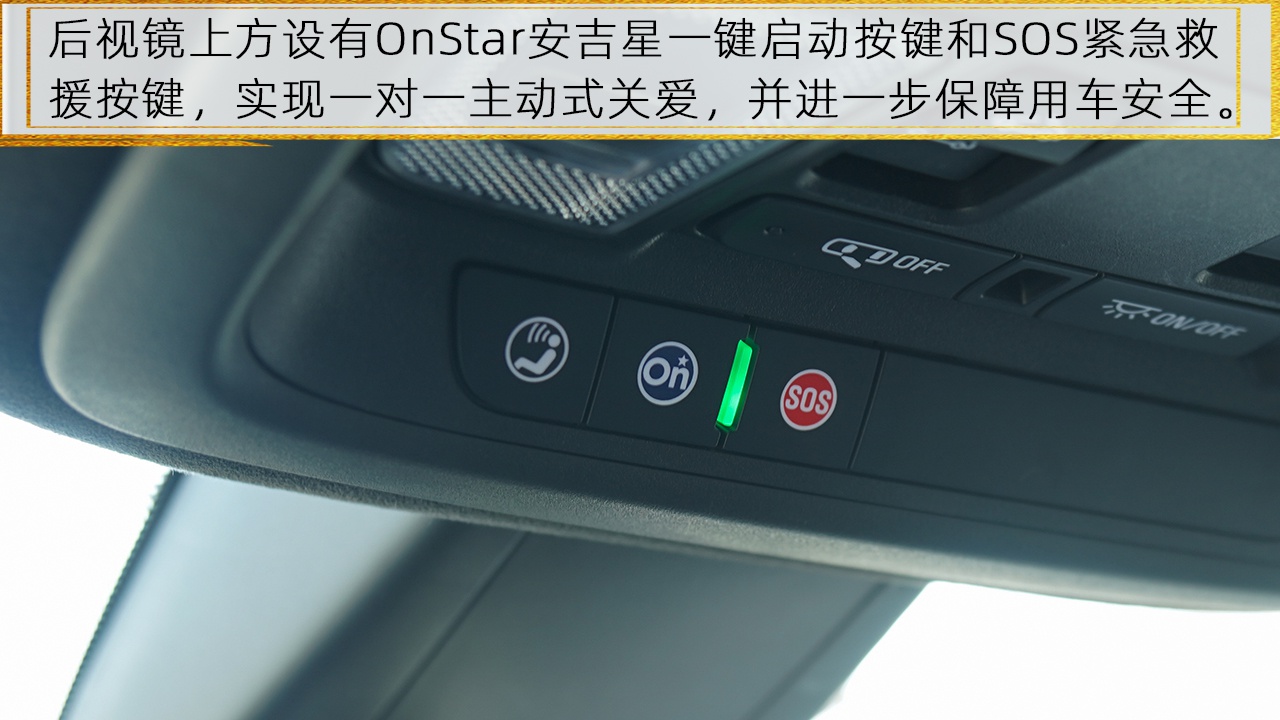 在中控屏内和后视镜旁,都设置有OnStar安吉星一键启动按键,OnStar安吉星系统为用户提供了专业顾问24小时实时在线,一对一主动式关爱,集成碰撞自动求助、紧急救援协助、车况检测、导航、安全保障和手机App应用等七大类22项专属服务。