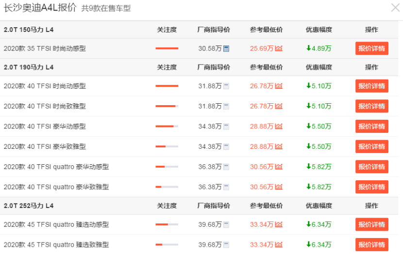 奥迪A4L指导售价:30.58-39.68万元,优惠幅度:6.34万元,奔驰C级指导售价:30.78-47.58万元,优惠幅度:3.34万元。从它们之间的售价可以得知,奥迪A4L的起售价和奔驰C级的起售价相差不大,但是,在顶配车型的价格上,奔驰C级要高出不少,并且,优惠幅度也没有奥迪A4L大,因此,奥迪A4L在价格方面更具有优势。