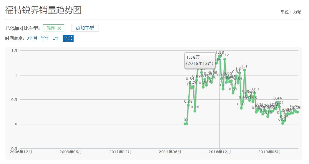 可以说,锐界的销量奇迹就定格在了2016年的12月,而在随后的好几年时间里,虽然锐界也有过在2017年12月卖出1.04万的不错销量表现,但越往后走,锐界的销量就越是在走下坡路。