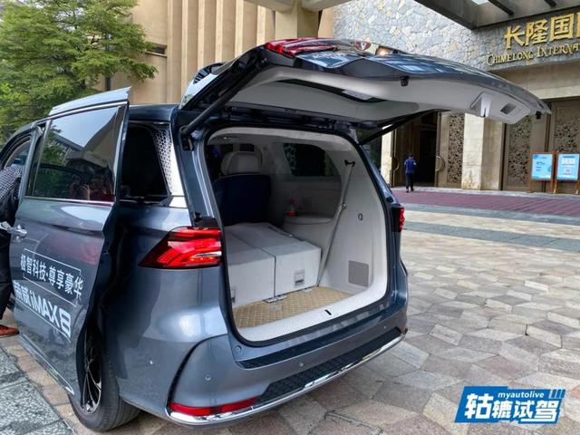 还有一个小亮点就是,荣威iMAX8的第三排座椅推倒后还可以向前滑移,形成一个平整的二级平台,同时后备箱空间也有所拓展。