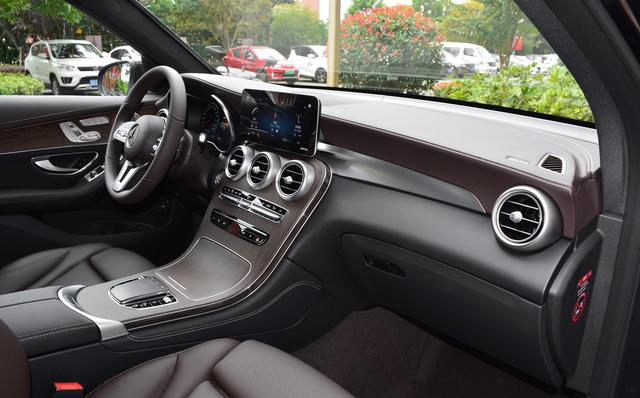 内饰方面,奔驰GLC延续了家族式的设计风格,依旧给人满满的豪华感,中控区域的大尺寸液晶显示屏,集成多种功能于一体,大面积木纹饰板的覆盖,加上镀铬装饰的点缀,以及大面积软性材质的包裹,从而营造出了一种舒适豪华的内饰氛围。