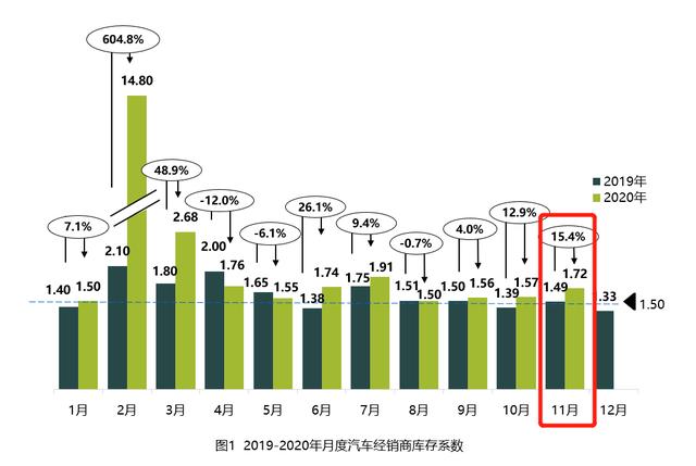 根据中国汽车流通协会发布的数据显示:11月份我国汽车经销商综合库存系数为1.72。按照行业惯例,库存系数在0.8—1.2之间,证明经销商库存合理,当库存系数大于1.5时,则证明库存达到了警戒水平,如果当库存系数大于2.5,则证明经销商库存压力大,存在经营风险,有可能随时跑路。