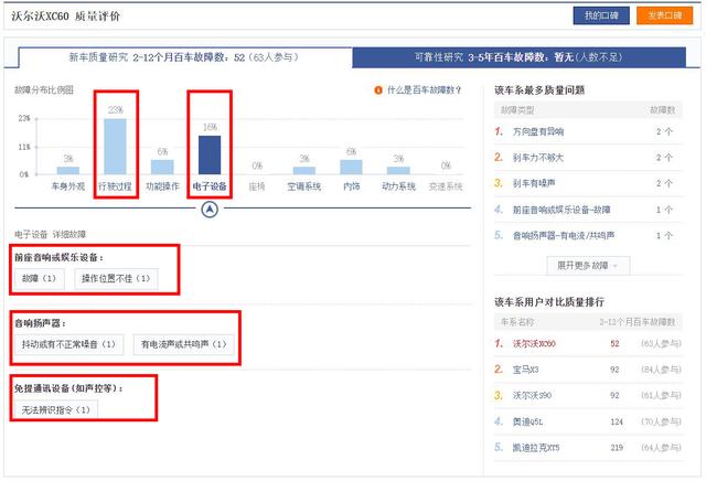 百车故障数方面,沃尔沃XC60今年的平均百车故障数为52个,作为一款豪华品牌SUV,这样的表现也算是相当不错了。至于具体发生较多故障的地方,也集中在行驶过程、电子设备以及内饰上。
