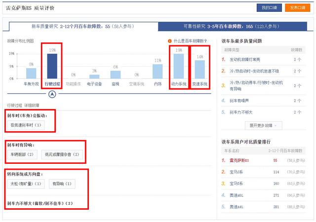 而在百车故障数方面,雷克萨斯ES今年3月至今的故障数总共为55个,排名所有统计车型中的第三位,数值非常之低。而从其所发生的故障数来看,雷克萨斯ES主要在行驶过程、动力系统、变速系统等方面发生故障的几率更高。