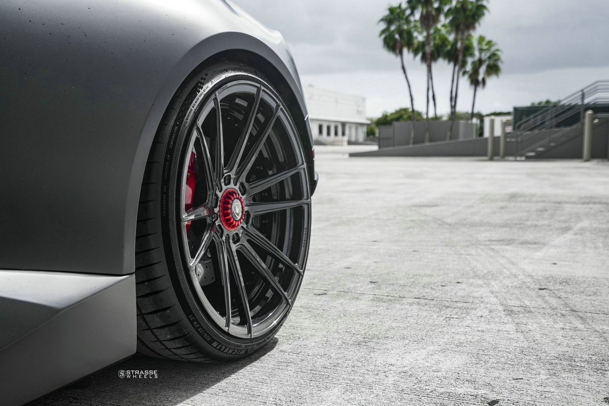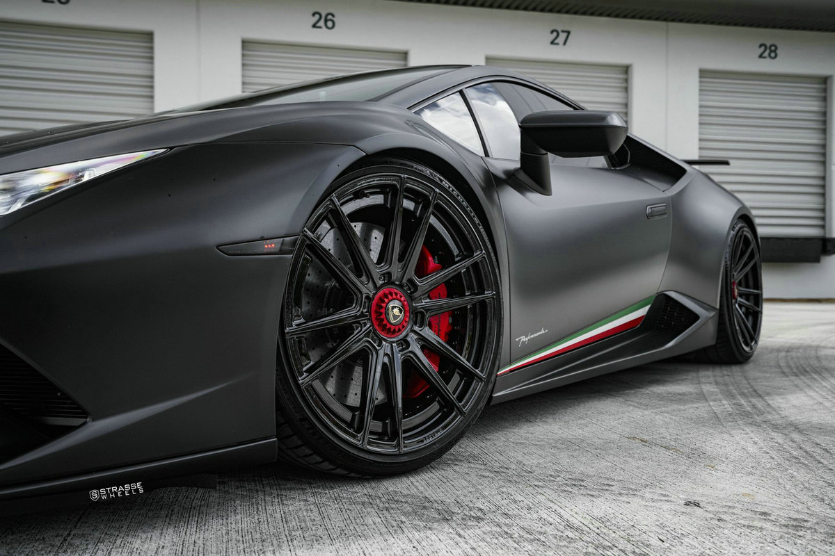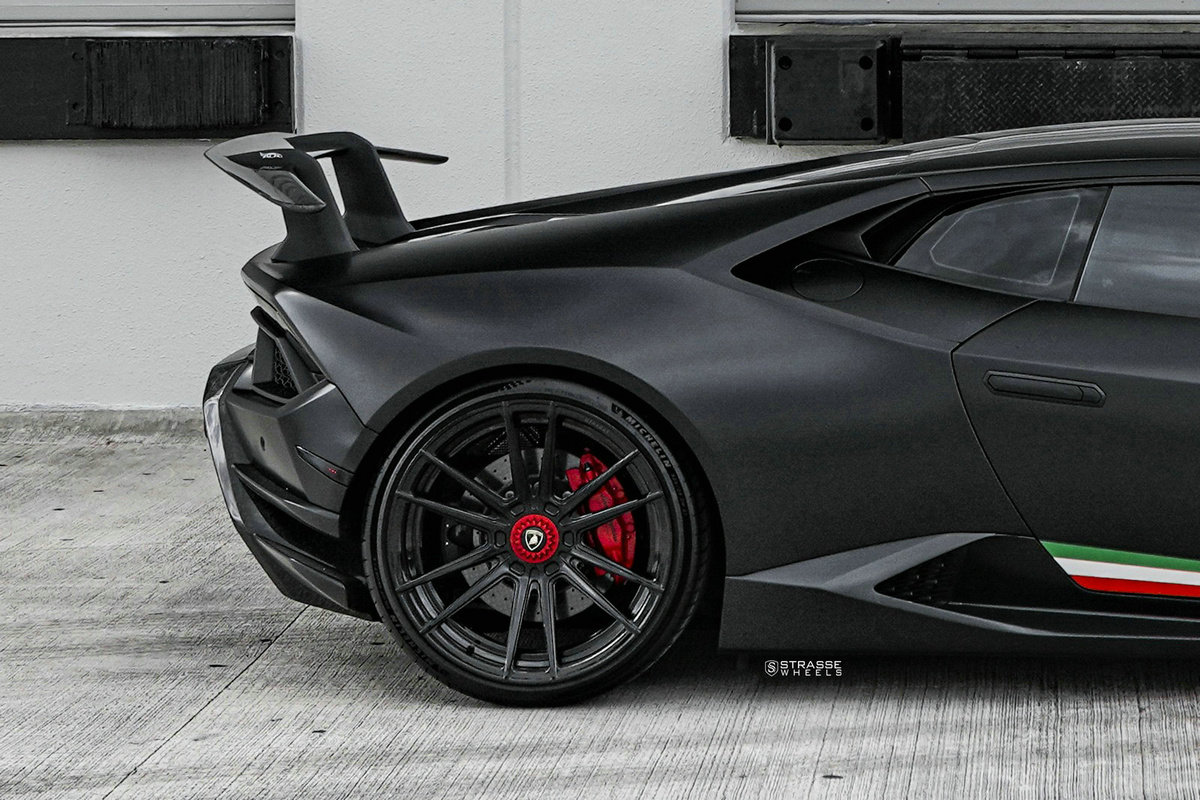 为了配合隐秘而激进的外观涂装,车主还为其配备了一套定制轮辋,这套轮辋被命名为SV12 Deep Concave Duoblock,并采用亮黑色处理。它们的尺寸为前20×9,后21×12.5,非常适合兰博基尼。