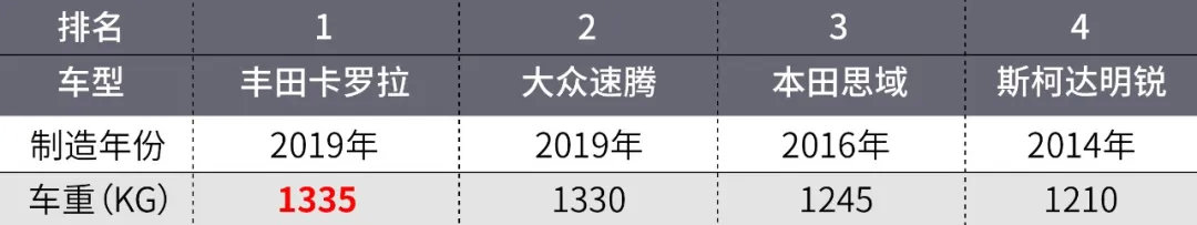 如上表所示,得益于TNGA架构为了质感和安全性增重的关系,在A级车的对比中,一汽丰田卡罗拉竟然成为了最重的选手!不仅重量达到了惊人的1335kg,同时竟然比国产后还大幅加长过的全新速腾还要重。要知道的是,速腾的尺寸和空间已经比卡罗拉大了快一个级别了,最终卡罗拉位列第一,速腾位列第二似乎也能说明一些问题。而第三名为本田品牌旗下的思域,第四名为斯柯达明锐。要知道斯柯达明锐已经是基于MQB平台打造的车型了,至于为啥还这么轻,可能就只有斯柯达工程师自己心里清楚了。