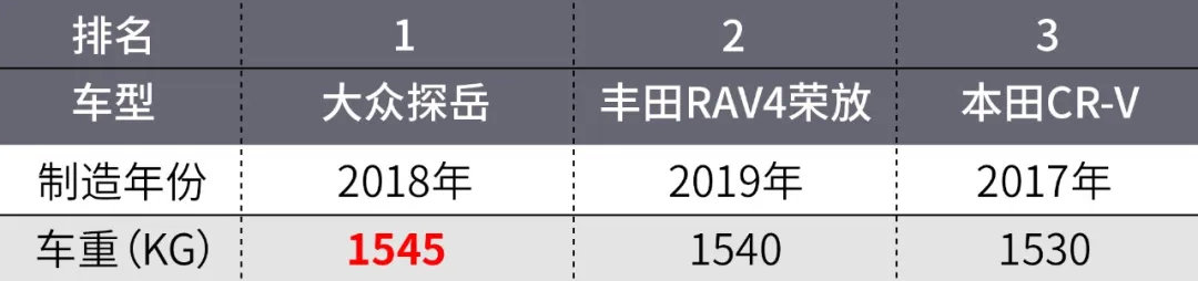 令人感到意外的是,在其他级别中体重差距很大的德、日两车系,在紧凑级SUV这里竟然打了个平手。其中最轻的本田CR-V只比最重的大众探岳轻了15kg。要知道,对于一台基础重量已经达到1.5吨的车型来说,15kg的重量完全不会对驾驶感受产生任何影响。这也从侧面说明,当车型达到一定级别后,日德双方的车重差异就已经不再明显了。