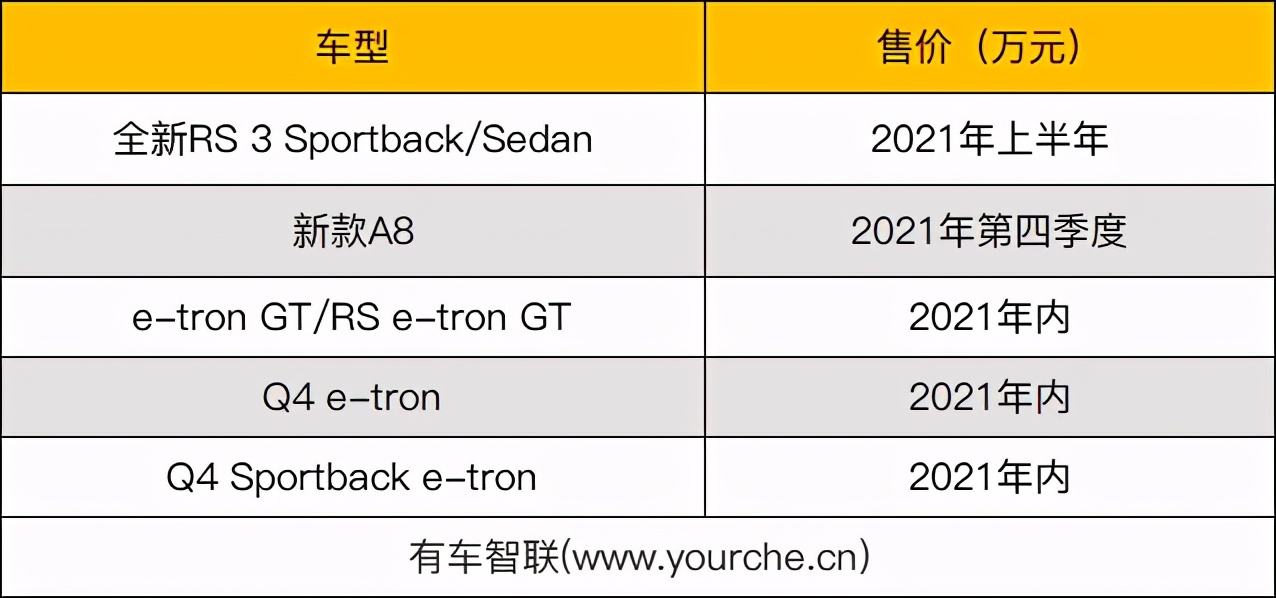 日前,有外媒公布了奥迪在2021年的新车发布计划,其中包括新一代RS 3、中期改款A8、e-tron GT (配置|询价)、Q4 e-tron 、Q4 Sportback e-tron等车型,涵盖SUV、豪华轿车、纯电动汽车、性能车等领域。结合此前消息,奥迪Q4 e-tron将于2021年于国内上市。