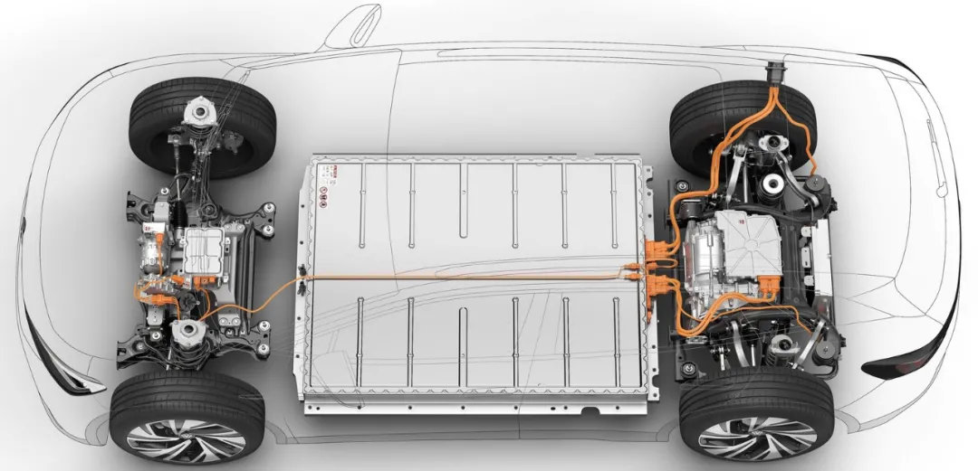 MEB平台是大众专门为电动车设计的平台,因此它在前后桥的位置都给电机预留了空间,前后轴之间则是为电池组设计。此外,由于电机本身所占体积要远小于传统汽油发动机和变速箱,因此MEB平台的车型普遍具有长轴距、短前悬的造型,这样就能在有限的体积内尽可能让前后轴之间电池包的空间变大,进而提升车辆的续航能力。