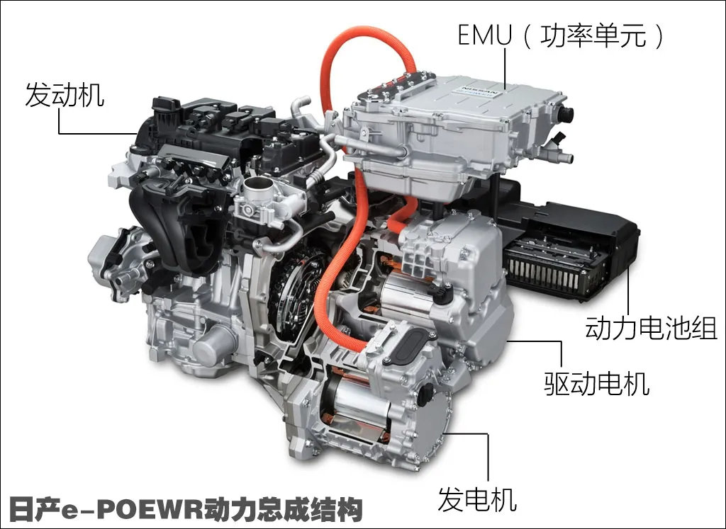 日产e-power大家可能会比较陌生,这套系统其实目前已经在海外上市,相比丰田的THS和本田的i-MMD,日产的混动更偏向小型车一些。从结构上来看,e-power可以理解为,去掉了发动机直驱的本田i-MMD。这套系统由一台1.2L三缸自然吸气发动机、发电机、驱动电机、电池组共同构成。