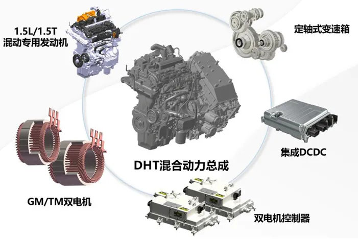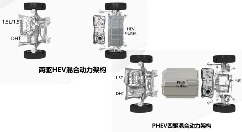 比亚迪继续走自己的插电混动路线,而长城则带来了自己的全新DHT混动技术。相比采用插电路线的比亚迪,长城这次选择了正面硬刚日系的全混动技术。长城的DHT混动包括常规非插电式HEV混动,以及插电式的PHEV混动,并且每种形式都有高低功率可选,插电混动版本甚至还有搭载P4电机的电四驱系统。