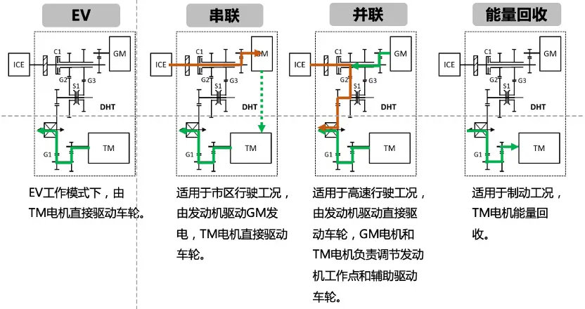 在高速模式下,发动机可以通过固定齿比的变速箱直接驱动车轮。但是与本田i-MMD的纯发动机直驱不同,长城的DHT在发动机直驱车轮的同时,驱动电机也可以在车辆需要动力请求时辅助驱动,实现更强的高速加速能力。
