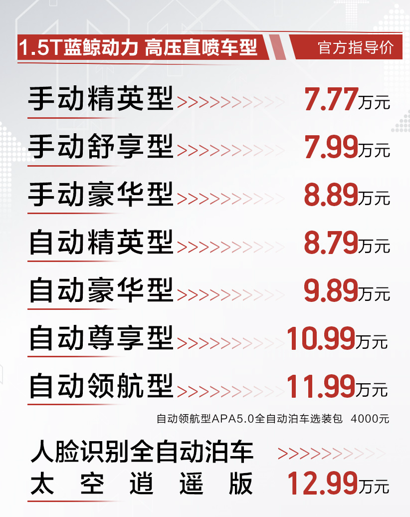 对于推荐车型呢,我们推荐小伙伴看看售价10.99万元的自动尊享型,配置方面配有19寸轮毂、并线辅助、后驻车雷达、360°全景影像、定速巡航、可开启全景天窗(自动豪华版为不可开启全景天窗)、车顶行李架、无钥匙进入、无钥匙启动、远程启动、真皮多功能方向盘、行车记录仪、仿皮座椅、主驾座椅电动调节、10.25英寸中控大屏、GPS导航、智能与应控制、OTA在线升级、车联网、6扬声器、感应雨刷、自动空调、后排出风口等。