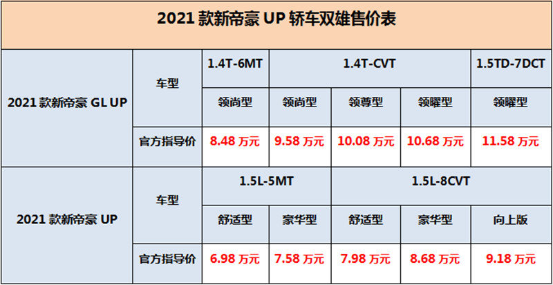 2021款新帝豪UP:6.98万-9.18万元,造型、智能升级,稳坐7万级家轿性价比之王