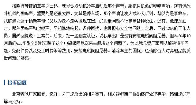 这一位2020款奔驰GLB的车主反映,自己拿车的时候开始,就感觉发动机的异响,并且还是很大声音的那种,不少友人还以为车主买了一台事故车,找到4S店需求解决,工作人员给出的答复是正常现象。其实,就这一位车主反映的问题,还真不是个例,奔驰GLB的发动机异响问题很普遍,不知道是"通病"还是什么原因,导致这一问题的投诉是只增不减。